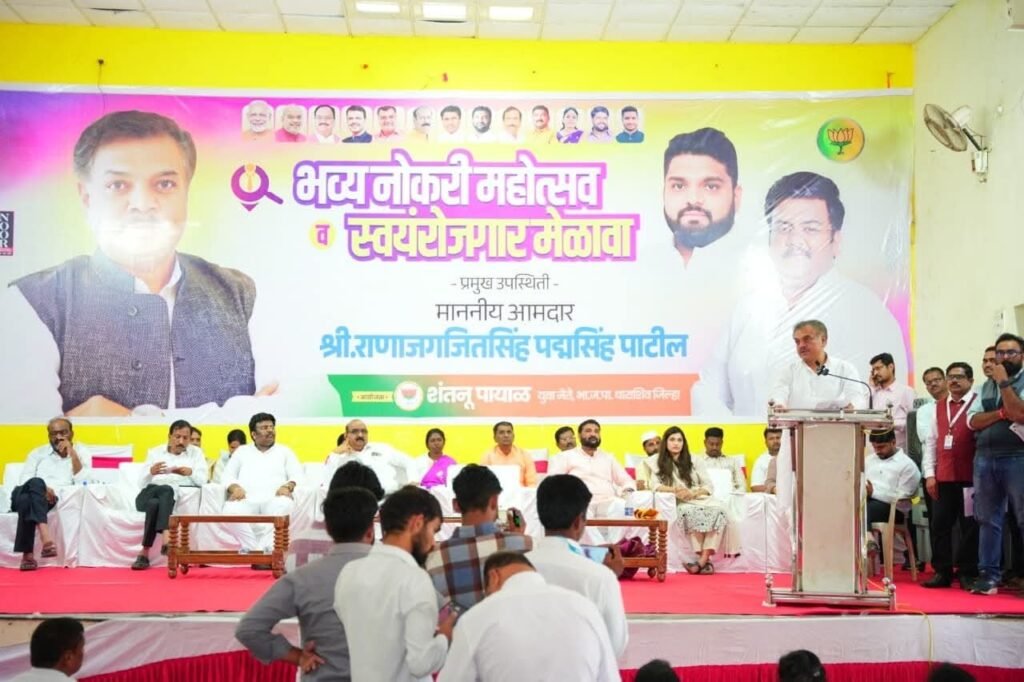 धाराशिव, पुष्पक मंगल कार्यालय येथे भव्य नोकरी महोत्सव व स्वयंरोजगार मेळावा उत्साहपूर्ण वातावरणात पार पडला. या महोत्सवाचा शुभारंभ आमदार राणाजगजितसिंह पाटील यांच्या हस्ते करण्यात आला. त्यांनी या प्रसंगी उपस्थितांशी संवाद साधत तरुणांना रोजगार व स्वयंरोजगाराच्या संधींचा लाभ घेण्याचे आवाहन केले.